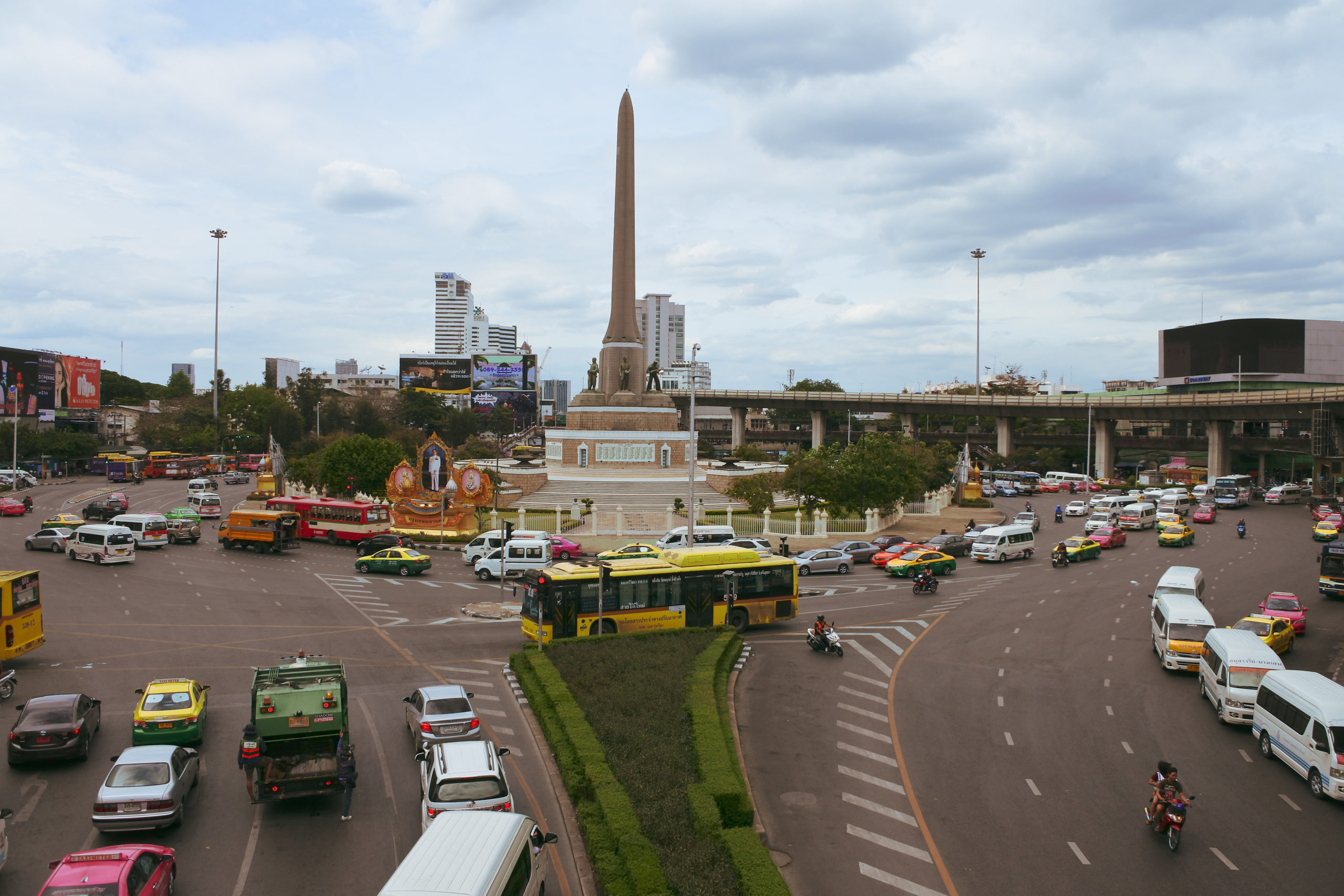 ภาพแรกที่ผมกดชัตเตอร์คือวิวจากสกายวอล์คที่ “อนุสาวรีย์ชัยสมรภูมิ” (Victory Monument) สำหรับคนญี่ปุ่นที่คุ้นเคยกับระเบียบวินัยบนถนนในโตเกียว การได้เห็นวงเวียนขนาดใหญ่ที่เต็มไปด้วยรถเมล์หลากสีและรถตู้ที่เบียดเสียดกันแบบนี้ มันเป็นภาพที่น่าตื่นตาตื่นใจมากครับ มันคือ “ระเบียบท่ามกลางความวุ่นวาย” ที่สะท้อนชีวิตคนกรุงได้อย่างดีที่สุด
